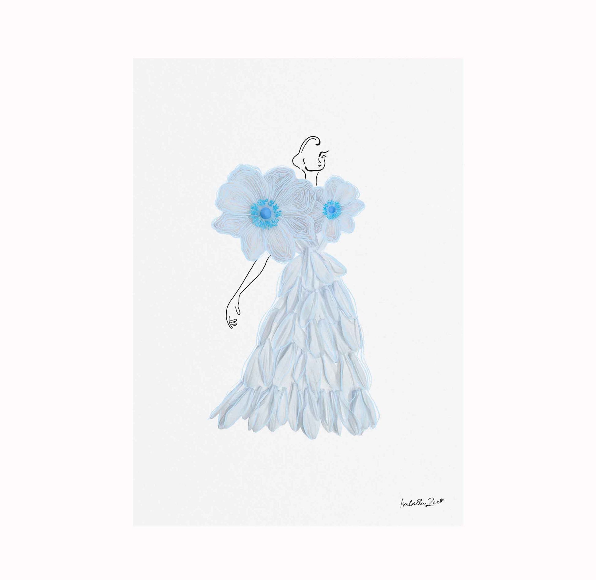 Discover the gorgeous 'Cassia' print, part of the vibrant 'Flower Girls' series, featuring a beautifully crafted gown made entirely from peach coloured carnation petals— the perfect floral addition to any space.